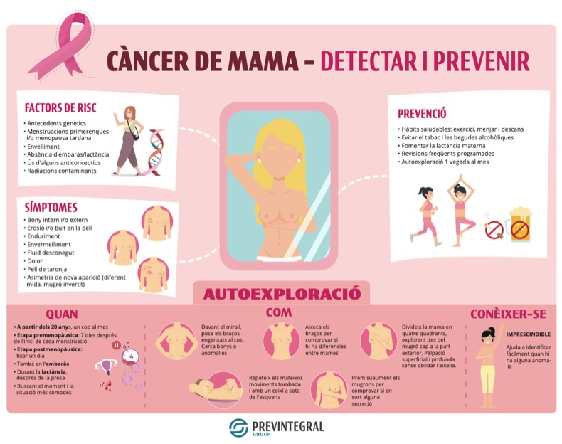 La prevenció és un altre element bàsic per reduir l’impacte de la malaltia. Malgrat que no se’n coneixen les causes exactes, el Codi Europeu contra el Càncer recull un seguit de recomanacions per disminuir el risc de tenir un càncer de mama: mantenir un pes saludable i evitar l’obesitat (especialment després de la menopausa), fer activitat física regularment, reduir el consum d’alcohol i practicar la lactància materna.